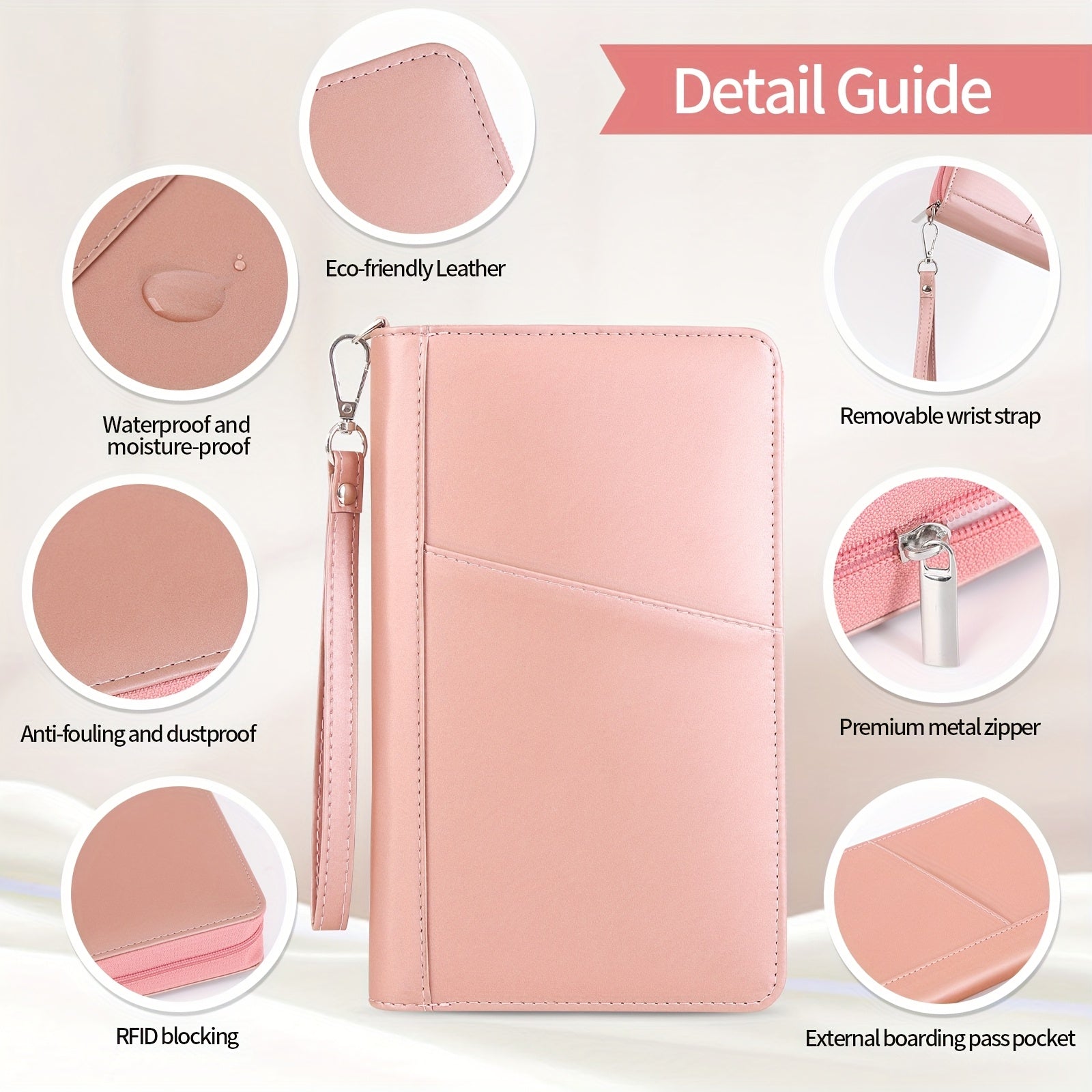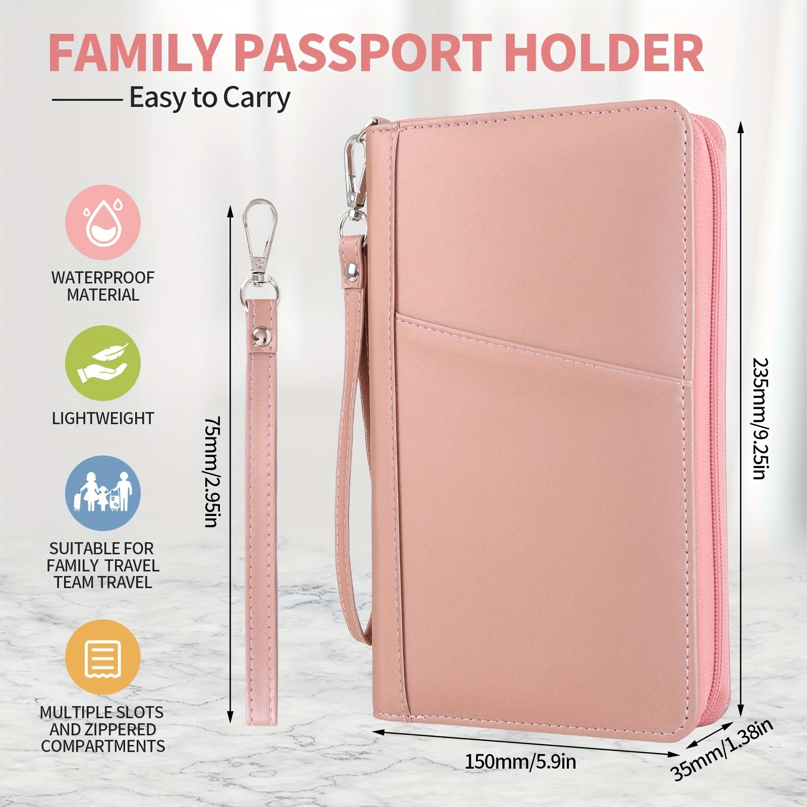 Key Features: KISSKI RFID Blocking Waterproof Faux Leather Passport Holder for Family Large Capacity Travel Document Organizer with Multiple Compartments Credit Card Slots & Pen Holder Lightweight Pink Travel Wallet. It comes with RFID - blocking and waterproof features, multiple compartments, and a durable zipper closure.